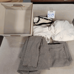 Lote 539 05 PEÇAS DE ROUPAS E CAIXA COM AVARIA. LOC. MEZANINO. OBSERVAÇÃO: SUGERIMOS A VISITAÇÃO E VISTORIA PESSOALMENTE DOS LOTES ANTES DE EFETUAR LANCES, BENS NO ESTADO EM QUE SE ENCONTRAM, PODENDO CONSTAR AVARIAS NÃO ESPECIFICADAS NA DESCRIÇÃO. 1) LEIA ATENTAMENTE O REGULAMENTO ANTES DE EFETUAR LANCES, 2) FAÇA A VISITAÇÃO DOS LOTES, POIS OS BENS SERÃO VENDIDOS NO ESTADO EM QUE SE ENCONTRAM, SEM GARANTIA DE FUNCIONAMENTO E SEM DIREITO A TROCA, PODENDO EVENTUALMENTE APRESENTAR AVARIAS, AMASSADOS, RISCOS, SUJEIRA, AUSÊNCIA DE EMBALAGEM, MANUAL, ACESSÓRIOS, COMPONENTES E PEÇAS, 3) FRETE, DESMONTAGEM E EMBALAGENS POR CONTA DO COMPRADOR.