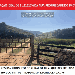 FRAÇÃO IDEAL DE 11, 11111% DA NUA- PROPRIEDADE DO IMÓVEL REGISTRADA NA MATRÍCULA N 17. 778 DO CARTÓRIO DE REGISTRO DE IMÓVEIS DA COMARCA DE ITAPEVA/ SP, QUAL SEJA, FAZENDA JJ, BAIRRO DOS PINTOS, NA CIDADE DE ITAPEVA/ SP, COM ÁREA TOTAL DE 85 ALQUEIRES, ( 2. 057. 000M). AVALIAÇÃO DA FRAÇÃO IDEAL DE 11, 11111% DO IMÓVEL ( 06/ 2025): R$ 963. 636, 67.. VALOR DA AVALIAÇÃO ATUALIZADA PELA TABELA DO TJ/ SP ( 11/ 2025): R$ 974. 370, 30 ( NOVECENTOS E SETENTA E QUATRO MIL, TREZENTOS E SETENTA REAIS E TRINTA CENTAVOS).. ONUS/ GRAVAMES: CONSTAM NA MATRÍCULA N 17. 778: R. 03 - USUFRUTO - JOSÉ BATISTA BUENO E MARIA ALICE LOPES BUENO, RESERVARAM PARA SI ENQUANTO VIVERAM O USUFRUTO VITALÍCIO DO IMÓVEL; R. 04 - PENHORA DO USUFRUTO, NA AÇÃO DE EXECUÇÃO FISCAL, MOVIDO PELA FAZENDA NACIONAL; AV. 05 - AÇÃO DE EXECUÇÃO PERANTE A 1 VARA CÍVEL DE INDAIATUBA/ SP - PROC. N XXXXXX. 2014. 8. 26. 0248 QUE DEU ORIGEM AO PRESENTE LEILÃO; AV. 06 - INDISPONIBILIDADE DE BENS PERANTE A 2 VARA DO TRABALHO DE RIO BRANCO/ AC - PROC. N 001