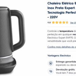 LEILÃO EXTRAJUDICIAL ! DESCRIÇÃO DO PRODUTO: CHALEIRA ELÉTRICA ELECTROLUX 1, 7L INOX PRETA EXPERT COM TECNOLOGIA PERFECTSENSE ( EKP70) 220V VALOR DO LOTE: R$ 599, 90 FORMA DE PAGAMENTO: EXCLUSIVAMENTE À VISTA VISITAÇÃO DOS BENS: ITENS DISPONÍVEIS PARA VISITAÇÃO NO DIA 15/ 12 ( SEGUNDA FEIRA ) MEDIANTE AGENDAMENTO PRÉVIO COM O LEILOEIRO, VIA TELEFONE OU WHATSAPP DO ESCRITÓRIO.