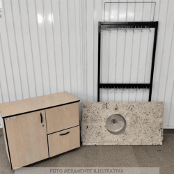 ( B148250) LOTE COM 01 PIA COM CUBA ( 1, 16 X 0, 62), 01 ARMÁRIO BAIXO EM MADEIRA 1 PORTA/ 2 GAVETAS ( 0, 43 X 0, 91 X 0, 75) SEM CHAVE, 01 SUPORTE DE FERRO COM 26 GANCHOS ( 1, 90 X 0, 77). PRODUTO( S) COM AVARIA( S) CUSTAS DE REPAROS POR CONTA DO ARREMATANTE, SEM GARANTIA ( VENDIDO NO ESTADO)..